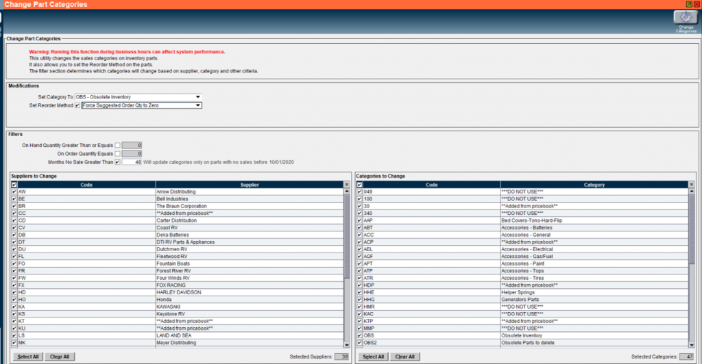 Begin by having your accounting team create a designated sales category for OBS (Obsolete) parts. This new category will act as a holding area for items that are no longer in demand or have been discontinued. Working with accounting ensures any adjustments align with GL accounts and financial records. - Access the Change Part Category Tool
