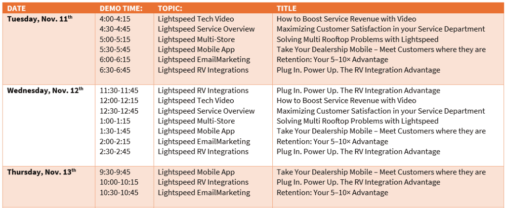 We will also have in-booth presentations every 30 minutes covering topics such as Lightspeed Tech Video, Service Overview, Mobile App, Multi-Store, RV Integrations, and more! We might also be doing mini giveaways during these presentations, so you won’t want to miss them.
