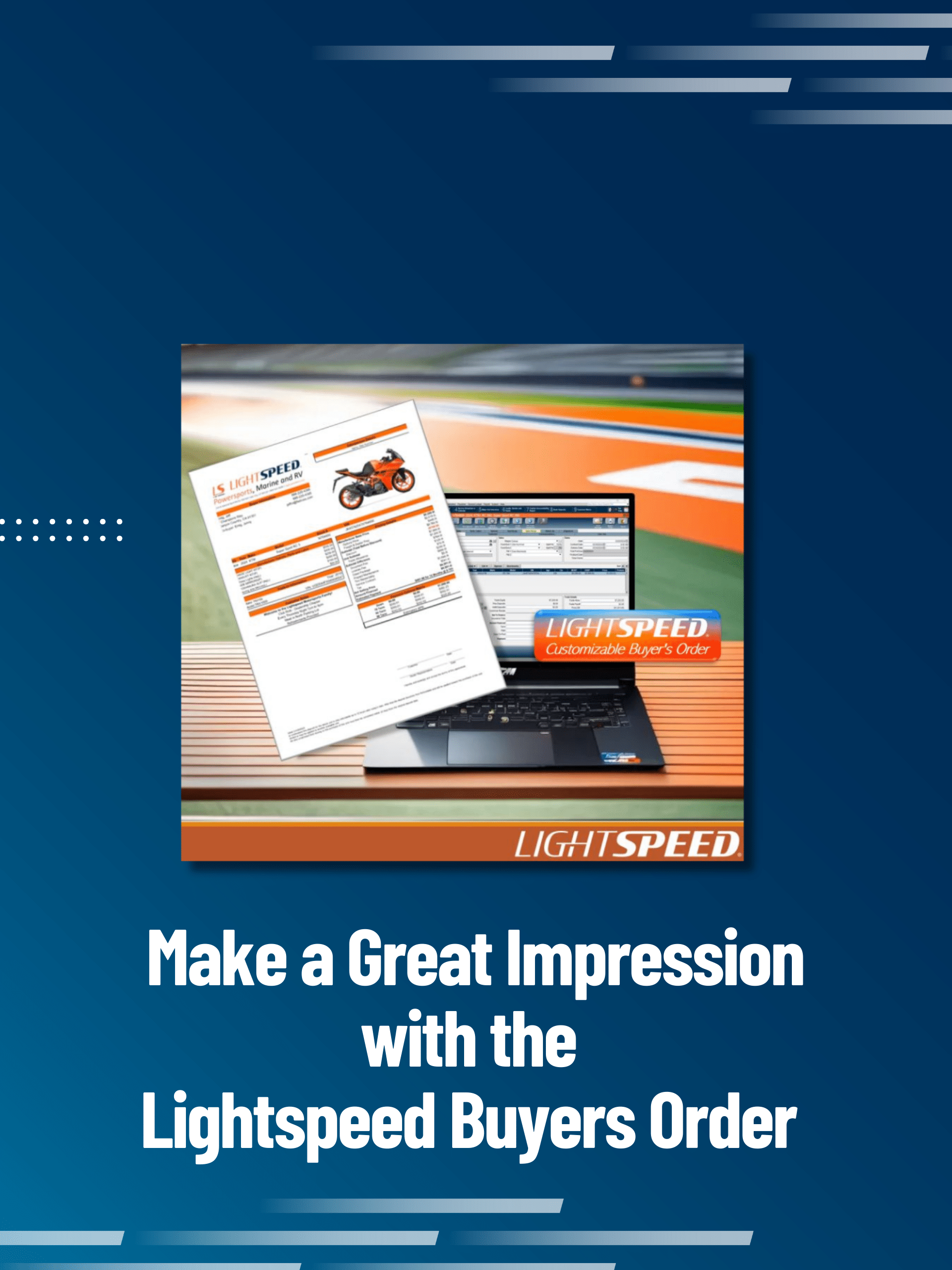 Will Rogers famously said, “You never get a second chance to make a first impression.” With the Lightspeed customizable Buyer’s Order, your dealership ensures every customer interaction starts with a professional, seamless, and personalized buying experience.